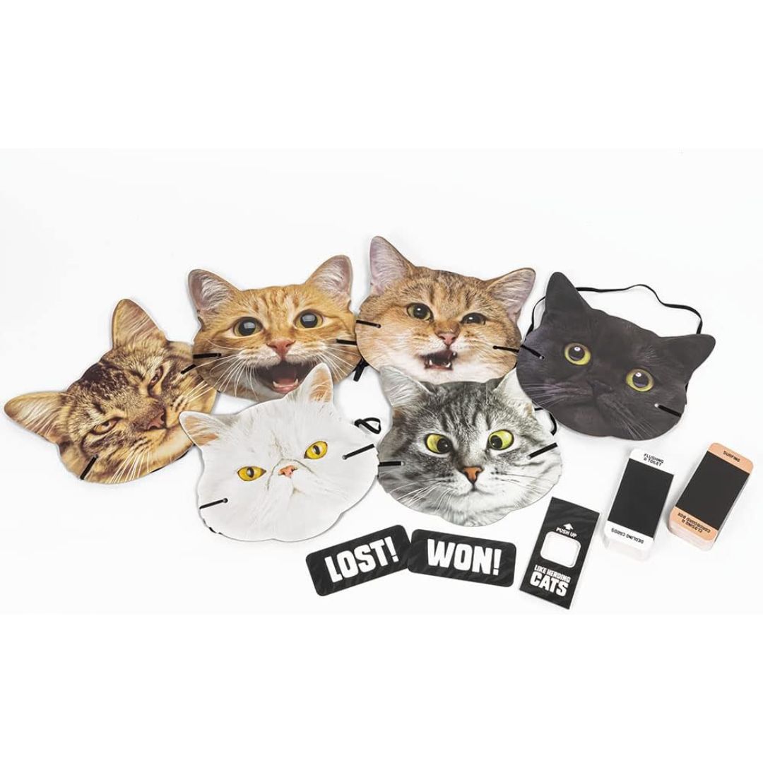 The cat-astrophic acting game! In each round, the cats don cat-mask blindfolds and act out one of two clues - but there's a cat-ch. When acted out, they may appear quite similar! The herders then group the cats and guess what they were acting. Work togeth
